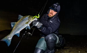 Winter stripers respond well to downsized gear. Instead of heavy surf setups used during peak season, a lighter outfit improves both presentation and enjoyment.